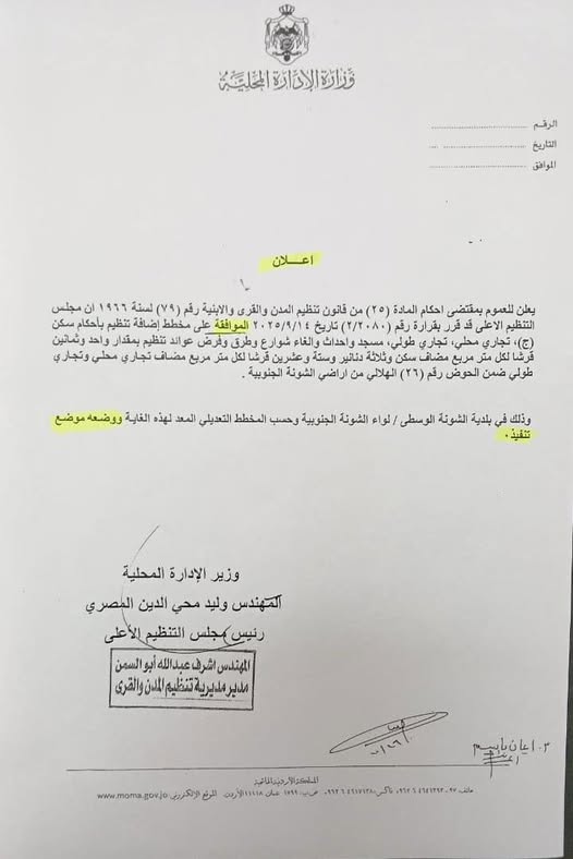 admin_alshounah نوفمبر 2, 2025 الاعلانات 0 Comments Announcement of the regulatory amendments plan within Basin No. (26) Al-Hilali from the lands of Southern Shouneh in the Middle Shouneh Municipality / Southern Shouneh District, implementation site.