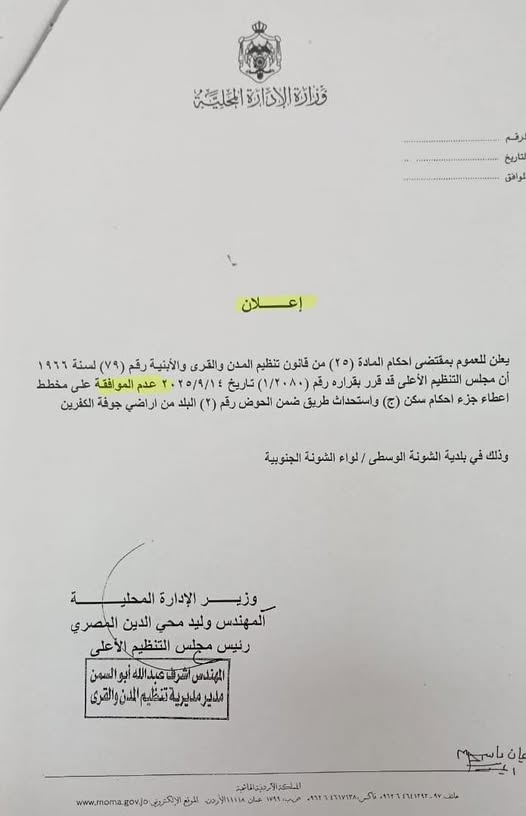 admin_alshounah نوفمبر 2, 2025 الاعلانات 0 Comments اعلان عدم موافقة على مخطط تعديلات تنظيمية ضمن حوض رقم (٢) البلد من اراضي جوفة الكفرين في بلدية الشونة الوسطى/ لواء الشونه الجنوبيه